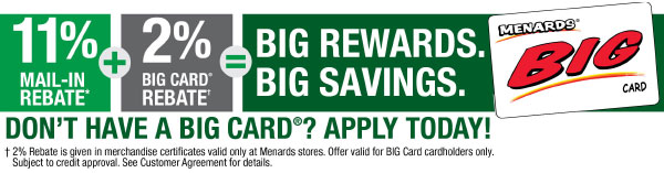 Menards credit programs big card® application pay/access big card. Apply for a top rated credit card in minutes! **buy 'n fly details • cardholder will receive one credit for each $1 in eligible net purchases at menards ® using the menards ® contractor card. • rebates under $5 will continue to roll over into the next rebate mailing until you reach the $5 minimum threshold. Rewardsget a $10 rebate on the first $100 you spend on the card.earn 2% rebate on menards purchases and 1% rebate on purchases made at speedway, holiday®, kwik trip® and kwik star® stores.plus, earn additional rebate savings on participating brands.rebates are issued four times a year, in the for view.
