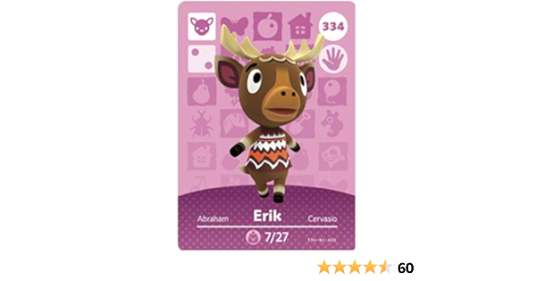 Find many great new & used options and get the best deals for erik animal crossing amiibo series 4 card #334 tracked au post geniuine at the best online prices at ebay! 10 jun 2016 24 mar 2016 17 jun 2016 Happy home designer 2.1 wave 1. Animal crossing nfc amiibo card. Zucker #364 animal crossing amiibo card. Bob # 018 animal crossing amiibo card authentic series 1 new never scanned!!! Add to favorites acnh june amiibo card animal crossing new horizons! Fast shipping and orders $35+ ship free. Ships from and sold by game on! Beau #167 animal crossing amiibo card. 72pcs nfc cards for acnh switch/switch lite/wii u with case 4.7 out of 5 stars 107. I have read that you do not have to scan the amiibo card 3 days in a row, but it remembers the number of previous visits. Animal crossing erik (チャック, chakku) is a lazy deer villager who first appeared in new leaf.his name is most likely a variation of elk, as he resembles a moose, known as eurasian elk in europe.
