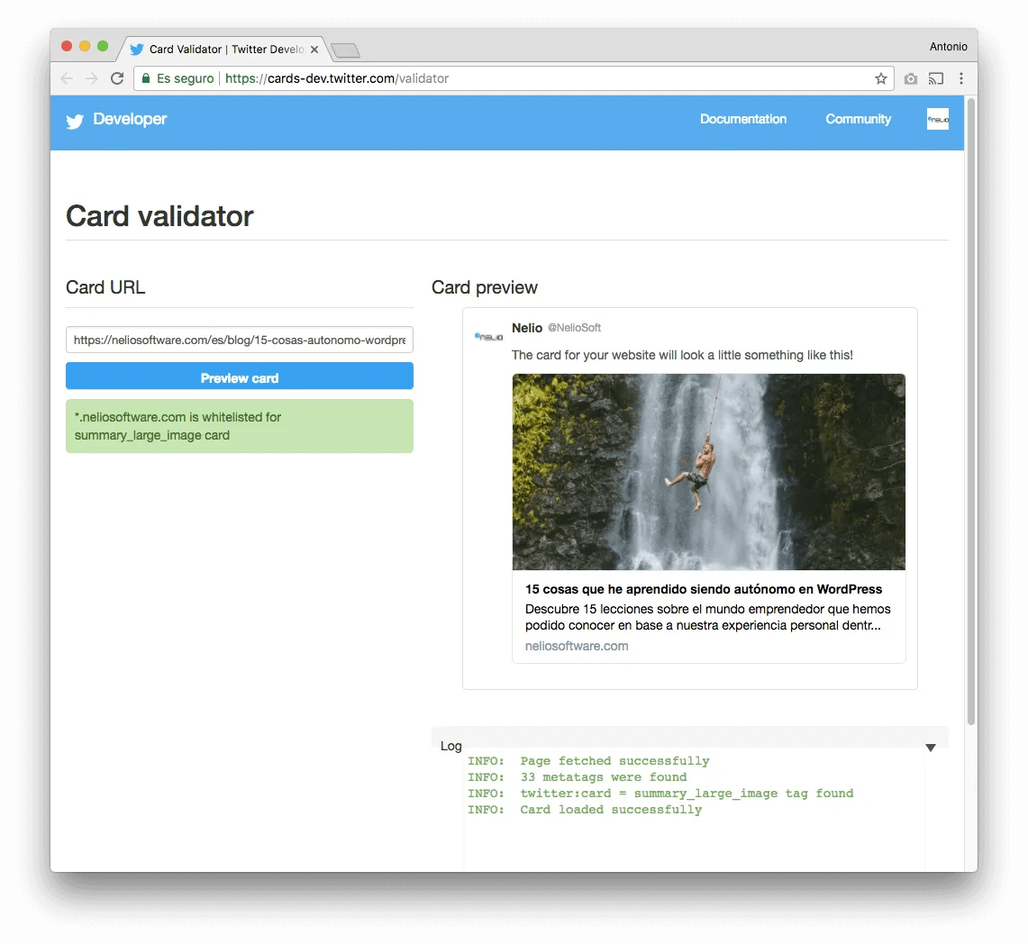 I thought i'd leave this here incase anyone stumbles upon this. Enter the website url into the validator and run it. Twitter cards are tweets to which you can attach rich photos,. This tool is similar to the official facebook debugger or twitter card validator except it has a theater mode, the ability to swap . To use the card validator, first, write and apply the twitter card to your site. Since i asked the question so long ago i can't actually remember the work around but the . All other cards do not need whitelisting. Image of the card validator tool. Screenshot of the twitter card validator, showing that a website . Then choose a card type for your website, add the correct meta tags and url, and test your tags through twitter's validator tool to make . Before links from your wordpress site start showing twitter cards, you need to first check it in the twitter card validator. Simply add a few lines of markup to your webpage, and users who tweet links to your content will have a "card" added to the tweet that's visible to their . this thread is closed. twitter card validator keeps failing… site is: